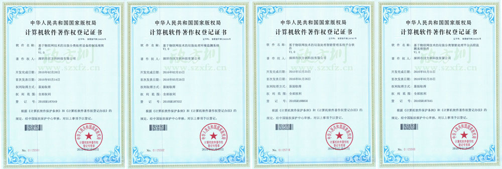 欣方圳獲得物聯(lián)網(wǎng)高新技術(shù)垃圾桶系統(tǒng)計(jì)算機(jī)軟件著作權(quán):基于物聯(lián)網(wǎng)技術(shù)的垃圾分類處理設(shè)備控制系統(tǒng)軟件、遠(yuǎn)程監(jiān)測系統(tǒng)軟件、環(huán)境監(jiān)測系統(tǒng)、智能管理系統(tǒng)平臺軟件