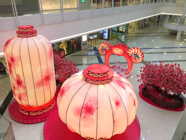 ? ? ? ? 商場內(nèi)一整套DP點(diǎn)陳列,一高一低兩個燈籠,互為主次,錯落有致,大小得當(dāng)。燈籠的燈頭深紅色底色上的中式祥瑞圖案,舒心奪目。燈籠上精心制作的手繪桃花,濃淡皆宜,大小得當(dāng),映襯桃花爛漫春節(jié)到來!燈籠外的地護(hù)圍欄也沿用祥瑞中式圖案上下貫通,設(shè)計(jì)一氣呵成。而旁邊的桃花,桃花樹上的小燈寵及旁邊的桃花塢石刻,在這樣的場景襯托之下,把觀眾對節(jié)日的情感推至高潮,也把浪漫溫馨紅火的春節(jié)季,表現(xiàn)得淋漓盡致!