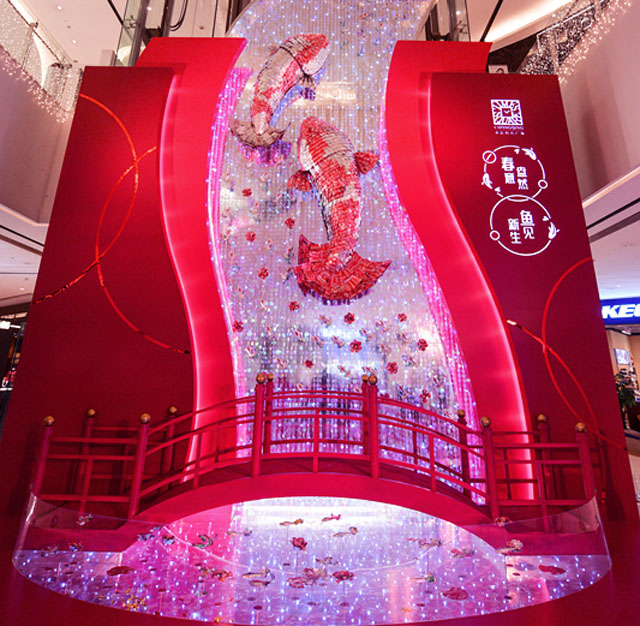 ? ? 2018年新年伊始,重慶時代廣場用2500個易拉罐打造象征幸福與新生的雙魚,祝福大家辭舊迎新,年年有余,1月28日,“春意盎然,魚見新生”新年主題美陳在B1層正式啟幕。