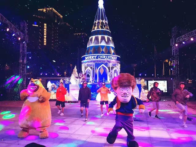 ? ? 益田假日廣場聯(lián)合華強集團斥重金打造了一座專屬“熊出沒”的冰雪王國。高達12米的冰雪城堡圣誕樹下,有熱情好客的熊大、熊二,有憨態(tài)可掬的北極熊,有踏著曼妙華爾茲舞步的麋鹿……無數(shù)個雪花造型的燈飾,閃閃發(fā)光,深南大道仿佛飄起了漫天飛舞的雪花。